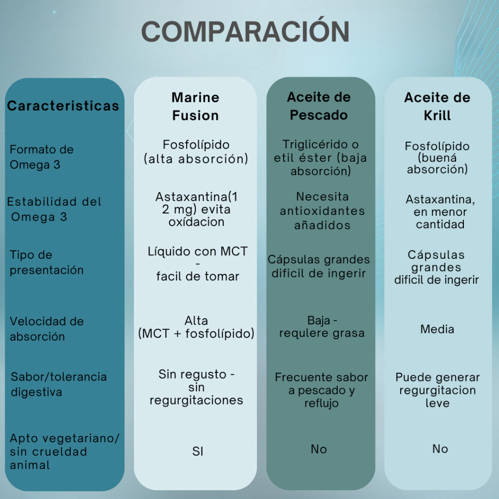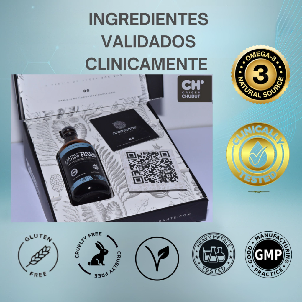 Los ingredientes de Marine Fusion® han demostrado clínicamente beneficios sobre el perfil lipídico, la salud neurológica, visual, articular y hepática. Su innovadora formulación en fosfolípidos y su combinación con MCT y astaxantina lo convierten en una alternativa segura, efectiva y moderna para quienes buscan resultados reales sin comprometer su bienestar digestivo ni ético.